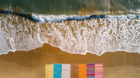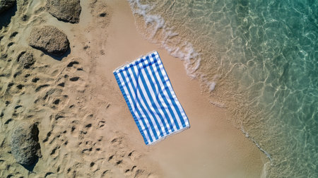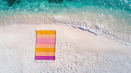 Aerial view of a striped beach towel on a sandy beach, perfect for adding text or creating a simple summer vibe, highlighting a day of relaxation