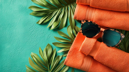 Enjoy a vibrant summer scene with stylish sunglasses and plush orange towels set against a soothing turquoise background, perfect for relaxation.