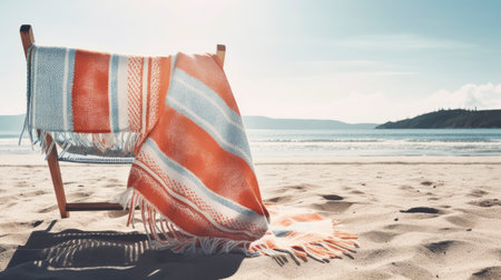 Beach chair with blanket on the sand. Summer vacation concept.