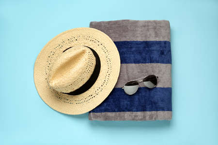 Beach towel, hat and sunglasses on light blue background, flat lay