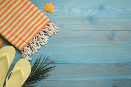 Beach towel and flip flops on light blue wooden background, flat lay. Space for text