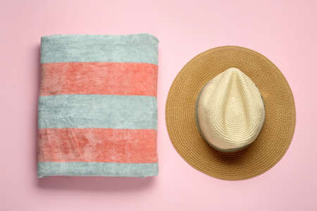 Beach towel and hat on pink background, flat lay