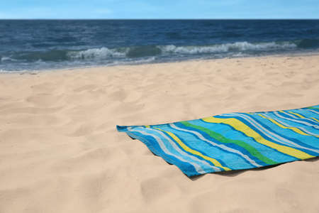 Bright striped beach towel on sandy seashore, space for text
