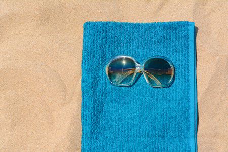 Red sunglasses on green and blue striped towel on sunny sand beach by the sea, copy space. Summer, sun, free time, relaxation and beach vacation.