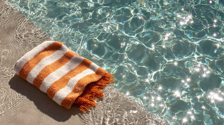 A bright orange and white striped towel is neatly folded on the edge of a pool. The water sparkles in the sunlight, creating a refreshing atmosphere perfect for relaxation.