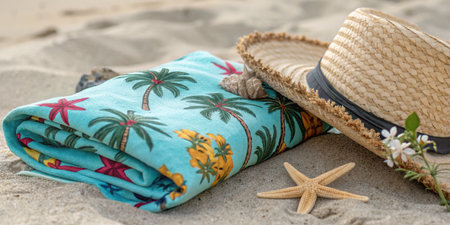A neatly folded beach towel with tropical palm tree and starfish patterns rests on sand, next to a straw hat and starfish. The background is a blurry sandy beach. The scene evokes relaxation and summer vacation. No people are present. The atmosphere is peaceful and serene.