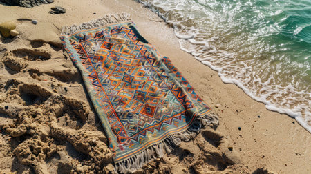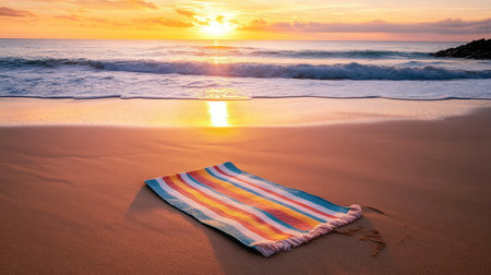 A vibrant, colorful blanket rests on a sandy beach, illuminated by the warm glow of sunset as the gentle waves lap at the shore. Perfect for relaxation.
