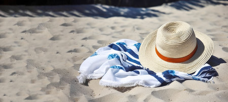 Sun hat with red ribbon and beach scarf on the sand in summertime travel vacations banner Generative AI Illustration.