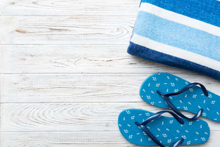 Summer travel concept. beach accessories. Flip flops and beach towel on white. Top view on colored background.