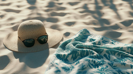 Straw hat, sunglasses and towel on the sand of a beach