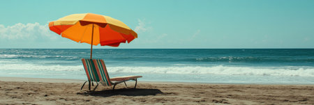 Relaxing beach setting features a striped sun lounger beneath a vibrant umbrella, ocean waves gently lapping the sandy shore on a sunny day.