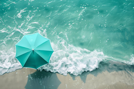 Umbrella on the beach and foam of sea wave. Top view. Generative AI illustration