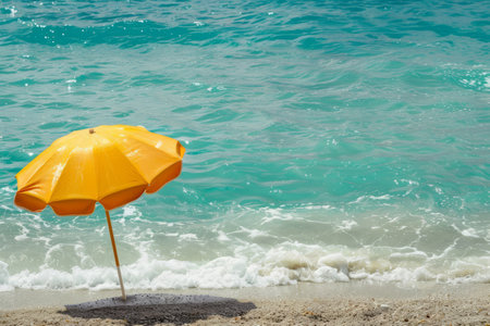 Yellow umbrella on sandy beach with turquoise sea and blue sky