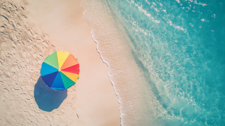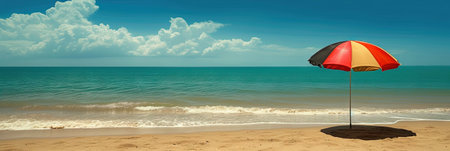 Vibrant beach scene with colorful umbrella on sandy shore and clear blue ocean for summer vibes