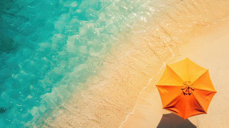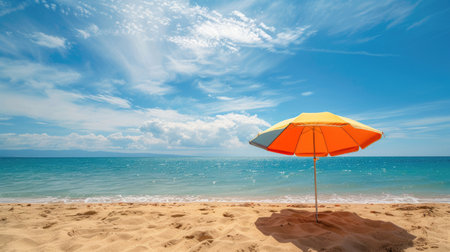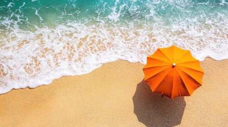 A striking orange umbrella perched on a sandy beach, casting a shadow over the golden grains as turquoise waves gently lap at the shore, creating a vibrant summer scene.