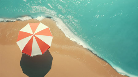 Aerial view of a red and white striped beach umbrella casting a shadow on soft white sand near the shoreline with gentle ocean waves. Minimalist summer scene perfect for travel, relaxation, and tropical vacation concepts.