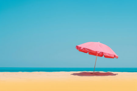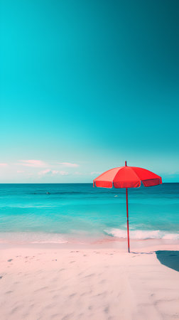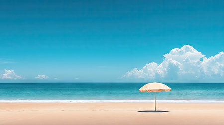 Minimal beach setup with umbrella canopy on pristine sand, vibrant blue sky, serene coastal getaway concept