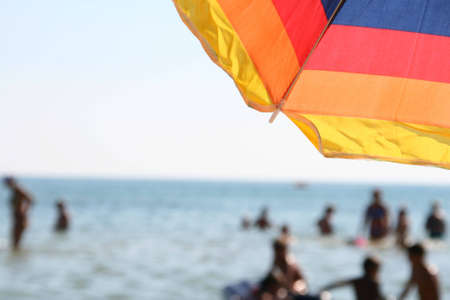 Ukraine, Coast of Black sea, part of parasol on foreground, peoples have rest on water on background