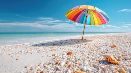 A vibrant beach umbrella stands on a sandy shore adorned with seashells, under a clear blue sky, capturing the essence of a summer getaway.