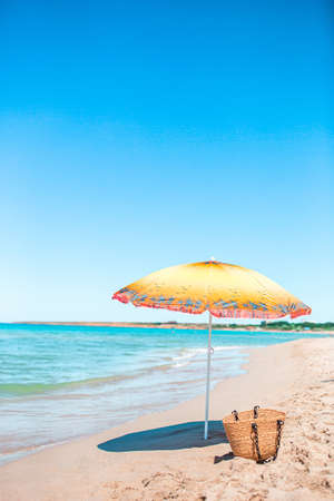 A colorful summer umbrella on the seashore on a clear day