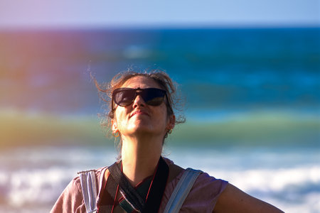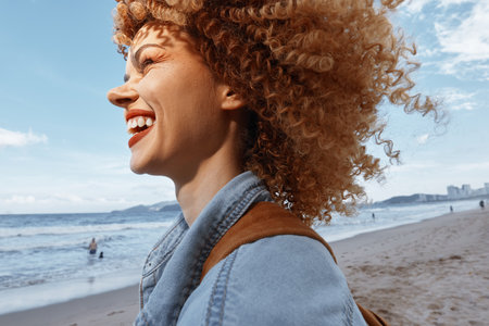 Smiling Woman on Beach, Embracing Freedom and Happiness: a Portrait of a Young Hippie Traveler with Curly Hair enjoying a Fun and Relaxing Vacation in the Beautiful Outdoor Nature, with Wide Angle Lens capturing the Joy and Adventure in the Blue Sky and Oc