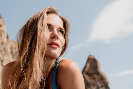 Woman summer travel sea. Happy tourist enjoy taking picture outdoors for memories. Woman traveler posing on the beach at sea surrounded by volcanic mountains, sharing travel adventure journey