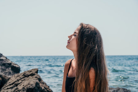 Young woman at beach embracing freedom, enjoying leisure time and happiness outdoors
