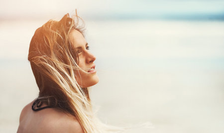Holidays, summertime and freedom concept. Lovely blonde girl relaxing outdoor by seaside enjoying sunny windy day