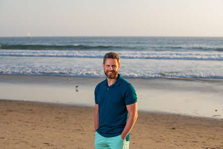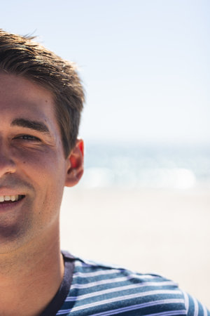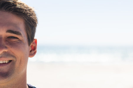 A young Caucasian man smiles at the beach, with copy space. His relaxed demeanor suggests a leisurely day outdoors by the sea, unaltered.