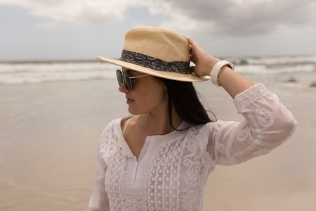 Front view of beautiful young woman holding hat and looking away on beach
