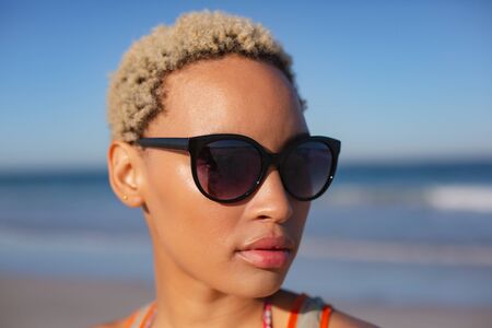 Close-up of beautiful African american woman in sunglasses looking away on beach in the sunshine