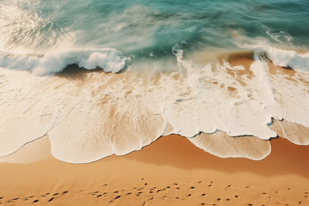 This stunning aerial shot captures the beauty of the ocean meeting the shore Turquoise waves roll in and crash onto the sandy beach creating a mesmerizing display of power and serenity The varying shades of blue in the water contrast beautifully with the golden hues of the sand The texture of the water and the smoothness of the sand create a visually appealing composition perfect for conveying a sense of tranquility and natural beauty Ideal for travel brochures coastal themes or relaxation imagery