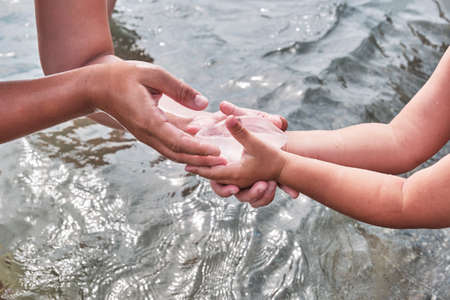 Mothers hands are giving carefully into hands of child a small transparent jellyfish
