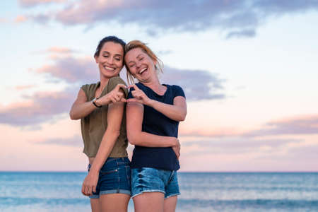 leisure and friendship concept - two happy smiling teenage girls or best friends at seaside making hand heart gesture. selective focus.