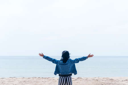 Woman raise hand up like bird shape at tropical sunset beach abstract background. Freedom feel good and travel adventure concept. Vintage tone filter effect color style.