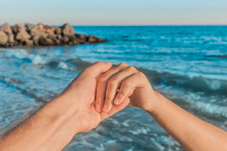 The hand of the guy holds a close-up of the girl's hand against the sea as the sunset approaches. Symbol of relationship concept.