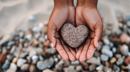 Holding a heart-shaped pebble in hands on a beach demonstrates self-care and connection with nature in a peaceful setting