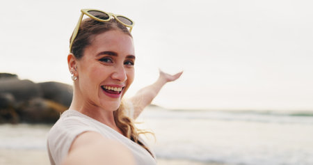 Happy woman, portrait and beach with selfie for vlog, photography or memory on vacation in nature. Face of young female person or tourist with smile for picture, moment or sightseeing by ocean coast
