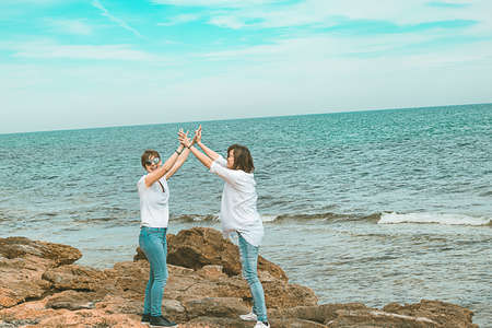 back view of two asia women having fun together on seaside