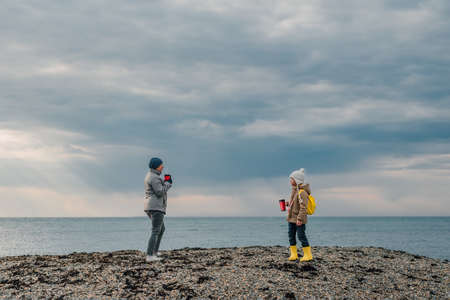 grandmother and granddaughter on a spring day off are engaged in health, walking along the seashore an adult woman and a little girl in rubber boots, with a yellow backpack, hold a bottle of water and a thermo mug with healthy tea in their hands. high quality photo