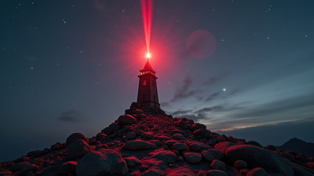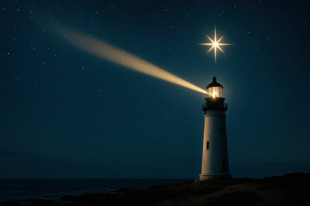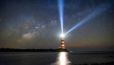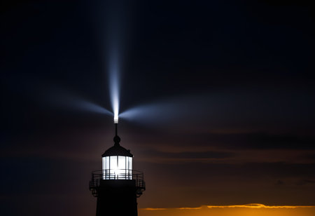 Lighthouse radiating bright golden light against deep night sky, symbolizing guidance, safety, and hope. Captivating composition for travel, maritime, and inspirational themes.