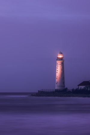 A lighthouse on the coast of the sea at dusk, its bright lamp is a landmark for ships. Seascape, nature background.