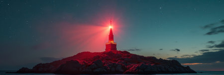 That the image is generated using AI. Majestic lighthouse illuminated by red light at twilight on rocky island coast.