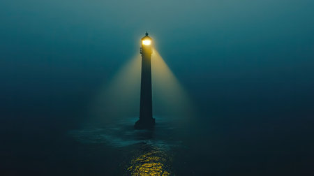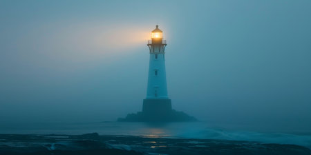 A striking lighthouse stands tall amid a foggy ocean, its beacon glowing brightly, guiding lost souls through the mist. The serene atmosphere enhances the beauty of this coastal scene.