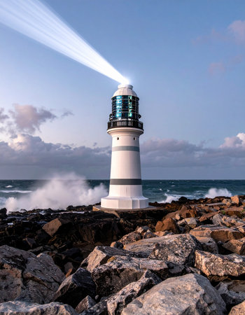 A powerful lighthouse stands firm on a rocky coast, its brilliant beam cutting through the twilight sky.