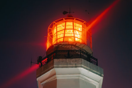 A powerful lighthouse beam pierces the night leading ships to safety. Concept Lighthouse, Navigation, Maritime, Safety, Guidance