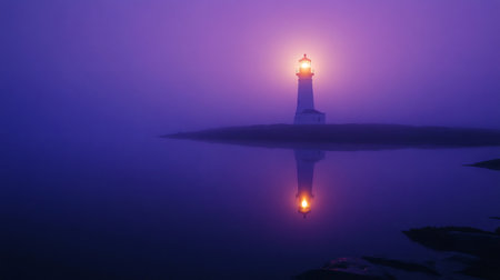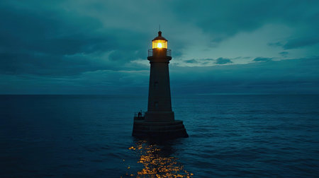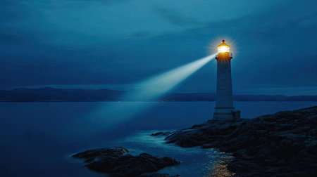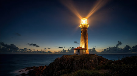 As twilight deepens into night, a steadfast lighthouse casts powerful beams of light across the calm ocean. Its unwavering glow serves as a beacon of hope and guidance, cutting through the darkness to ensure safe passage and symbolize direction and security.