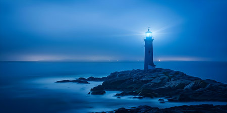 As twilight settles over the vast ocean, a steadfast lighthouse stands guard on the rocky coast. Its powerful beams cut through the deepening blue, a symbol of guidance, safety, and unwavering hope for those navigating the dark waters.