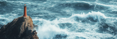 Red lighthouse is standing on a rocky coast during a storm, with big waves crashing around it, creating a dramatic and powerful scene of natures forces