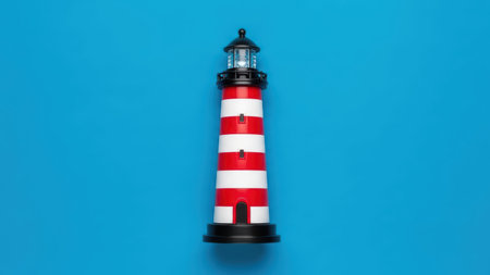 Red and white striped lighthouse model on blue background.